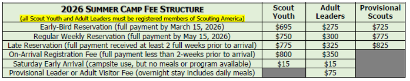 A $500 deposit is due with an Online Troop Reservation or paper Troop Reservation Form to hold your weekly session and campsite reservation for this coming season. The deposit can be applied toward your total camp fees, and all deposits are non-refundable after January 31, 2026. Priority registration is given until March 15, 2026 to troops that attended the 2025 season in the same site and camp week session. Marin-Sierra is one of the only Summer camps with NO additional charge for out-of-council troops and an all-in-one pricing model for all programs and activities! Payments are by troop only, not for individuals. A troop can add additional campers (youth or adult) any time, including when they arrive at camp. Use a new 2026 Troop Payment Form each time you make another payment. Early-Bird Fee - - - Scouts $695; Adults $275 Paid-in-full on or before March 15, 2026; includes free 2026 camp T-shirts (if you order by size). Due to vendor and delivery logistics, the FREE T-shirts are only available to those units who have paid-in-full for their attendees by March 15, 2026. Regular Fee - - - Scouts $750; Adults $300 Paid-in-full on March 16 or after, but not later than May 15, 2026. Newly-registered Scouts BSA youth or recently-bridged Webelos are just $725. Due to ordering and delivery logistics, the discounted T-shirt pricing is only available to those units who have paid-in-full for their attendees by May 15, 2026. Late Fee - - - Scouts $775; Adults $325. Paid-in-full on May 16, 2026 or later, but at least 2-weeks (14 days) prior to the start of your camp week session. Newly-registered Scouts BSA youth or recently-bridged Webelos are still just $750. On-Arrival Fee - - - Scouts $800 Adults $350 Within 2-weeks (14 days) of your camp session, please contact Marin Council directly to place your last-minute reservation with this form! Bring all monies to camp where you will complete payment with the Camp Director - - - DO NOT MAIL! New Scouts BSA youth or recently-bridged Webelos are still just $750 ($50 savings). Individual (Provisional) Camper Fee Provisional campers pay a slightly higher fee depending on their advance reservation; please see 2026 Provisional Scout Application Form. | Registration Process To register for your week of Scouts BSA Summer Resident Camp at Marin Sierra, register online NOW or fill out the 2026 Troop Reservation Form. You may fax the form to the Marin Council at (415) 454-5511, or mail it to the Council office at 225 West End Avenue, San Rafael, CA 94901; however, make sure your deposit payment of $500 accompanies the form to hold your camp week reservation. Be sure to give accurate contact information on the registration form, including an estimate of the number of Scouts and leaders you expect, and indicate which style of menu you prefer --- central dining (the majority of the week in the commissary area) or jamboree (the majority of the week in your campsite). Specific site reservations are assigned depending on availability and the size of the troop and the capacity of the campsite. Please indicate a second choice. If your troop does not occupy at least the minimum amount of the capacity of the site, the site may be shared or you may be moved to a different site. We will do our best to accommodate special needs and preferences. No deposit refunds are granted after January 31, 2026. Read our CMS FAQs Refund Policy Full refund before 01/31/2026; 75% - - - 02/01-03/31/26; 50% - - - 04/01-30/2026; 25% - - - 05/01-31/2026; No refunds starting 06/01/2026. Applications for partial refunds may be sent in writing to the Marin Council office in the event of medical emergencies or death in the family prior to the camp session. (Does not apply to unit deposits which are non-refundable after 01/31/26). |
